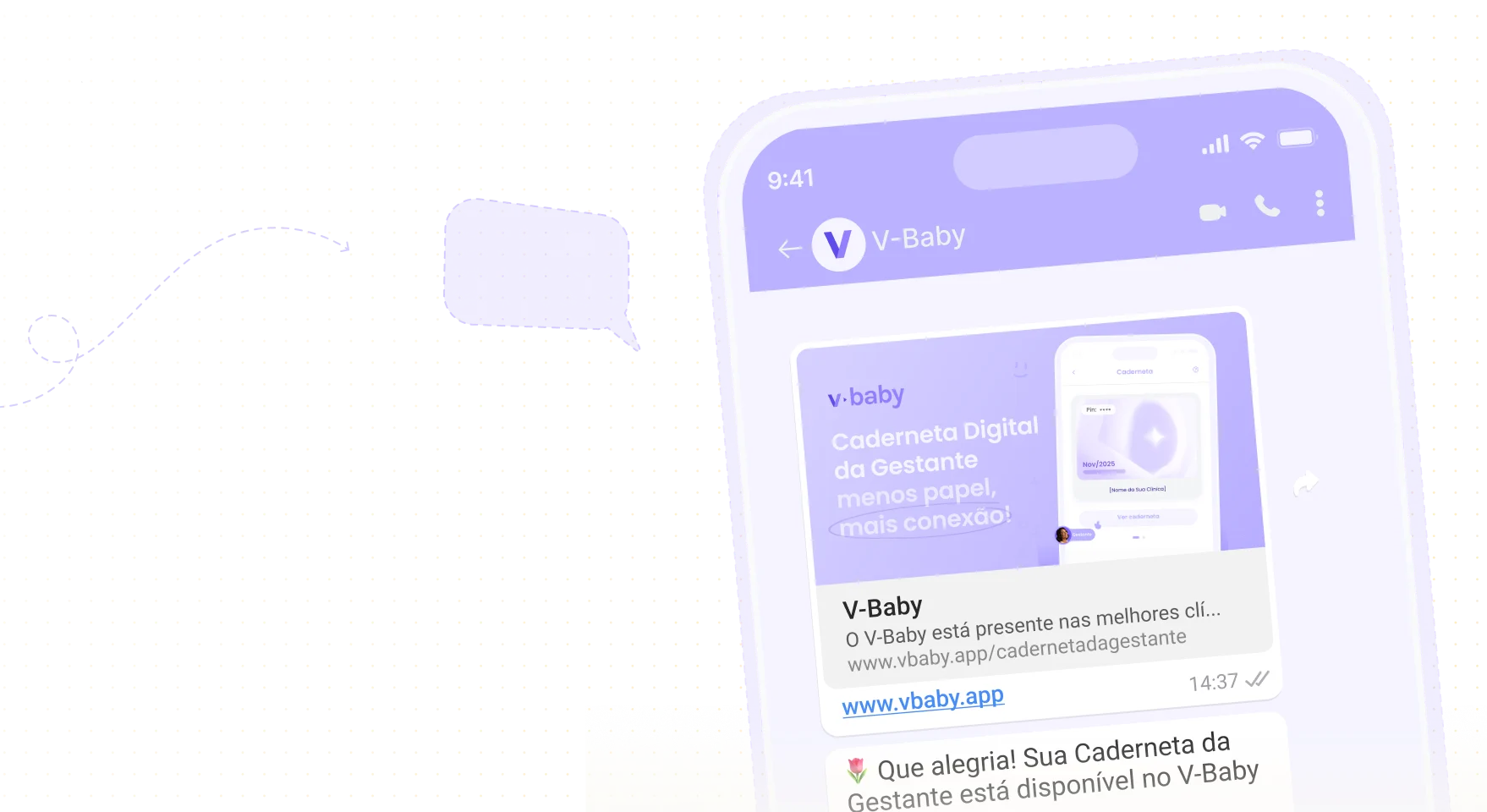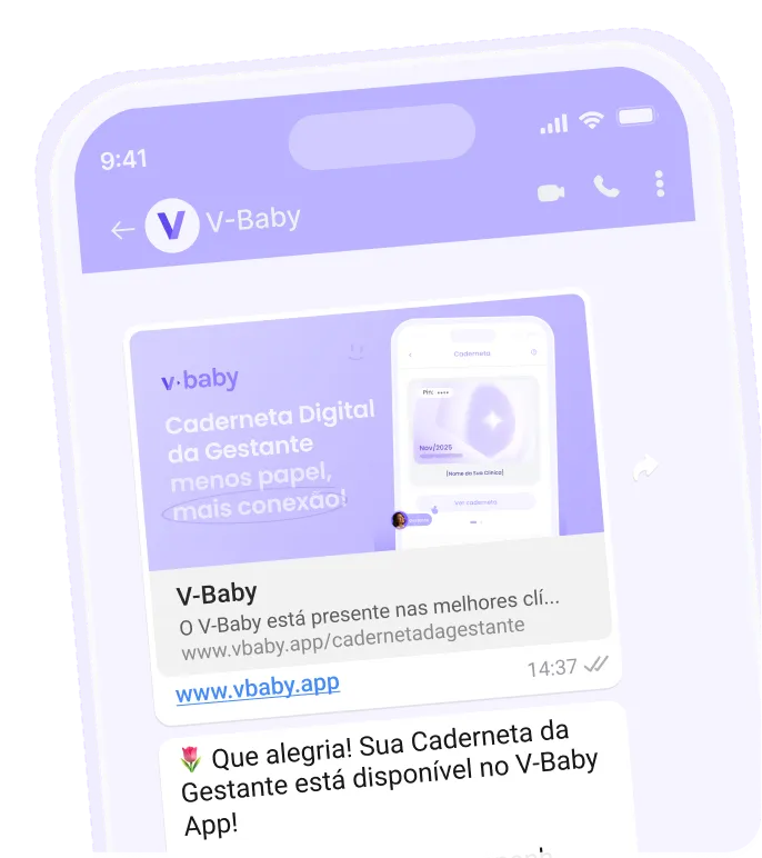 A gestante recebe um link seguro (por exemplo, via WhatsApp), instala/abre o aplicativo V-Baby e passa a ver a caderneta digital em formato PDF, com opção de salvar na Apple Wallet ou Google Wallet.